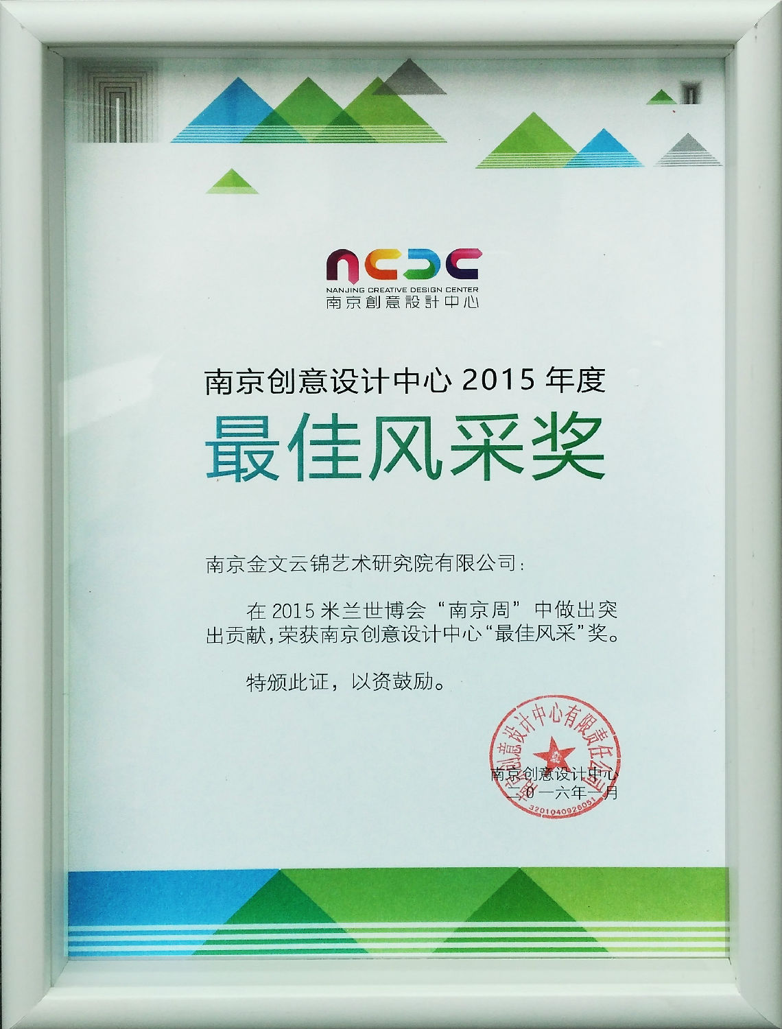 2016年1月26日,南京创意设计中心为答谢金文大师以及团队的努力贡献,为南京金文云锦艺术有限公司颁发“最佳风采奖”,以资鼓励。