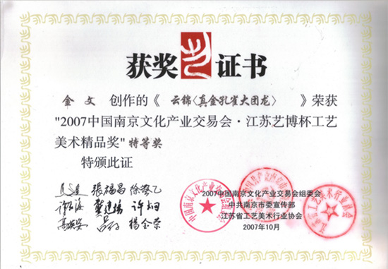 《真金孔雀羽大团龙》荣获“2007江苏艺博杯工艺美术精品奖”特等奖
