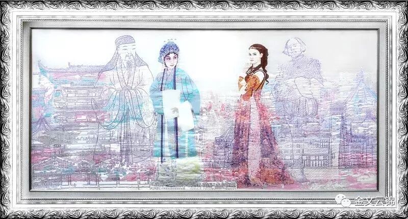 用云锦的传统工艺创新研究制作的,以中英两国伟大的戏剧家作品为表现主体的人物场景画。画面正中展现了至今还在舞台上不断演绎的鲜活人物,中国的牡丹亭剧主角杜丽娘和英国罗密欧与朱丽中剧主角朱丽叶。背后站着二位大师,伟大的汤显祖与莎士比亚。周边场景为第一次演岀汤的“黄鹤楼”剧场和一直演莎剧的“环球莎士比亚剧场”。这幅作品展现了中西经典文化碰撞与融合,色彩明快,虚实相映,层次分明,又赋有现代感。参加2016英国伦敦设计节南京周百分百展